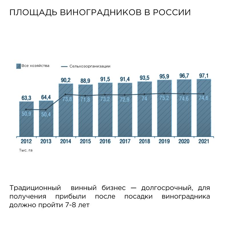 в 2022 году запущен федеральный проект «Стимулирование развития виноградарства и виноделия», направленный на увеличение площади виноградников 35% к 2030 году.